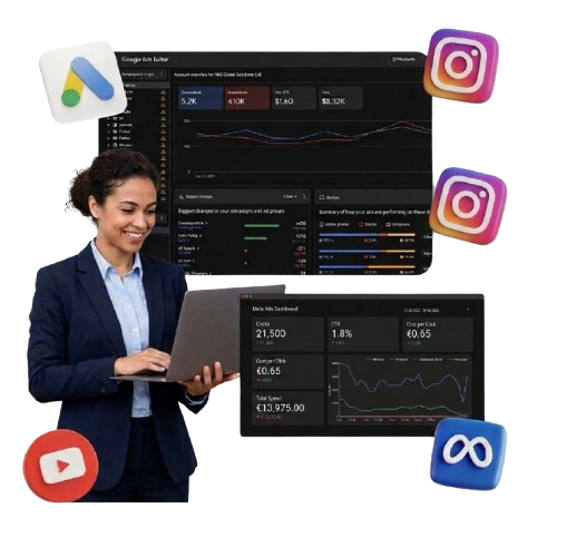 Reach the right audience and grow your business with powerful advertising campaigns. We create high-performing ads on Meta Ads Manager, Google Ads, and YouTube Ads